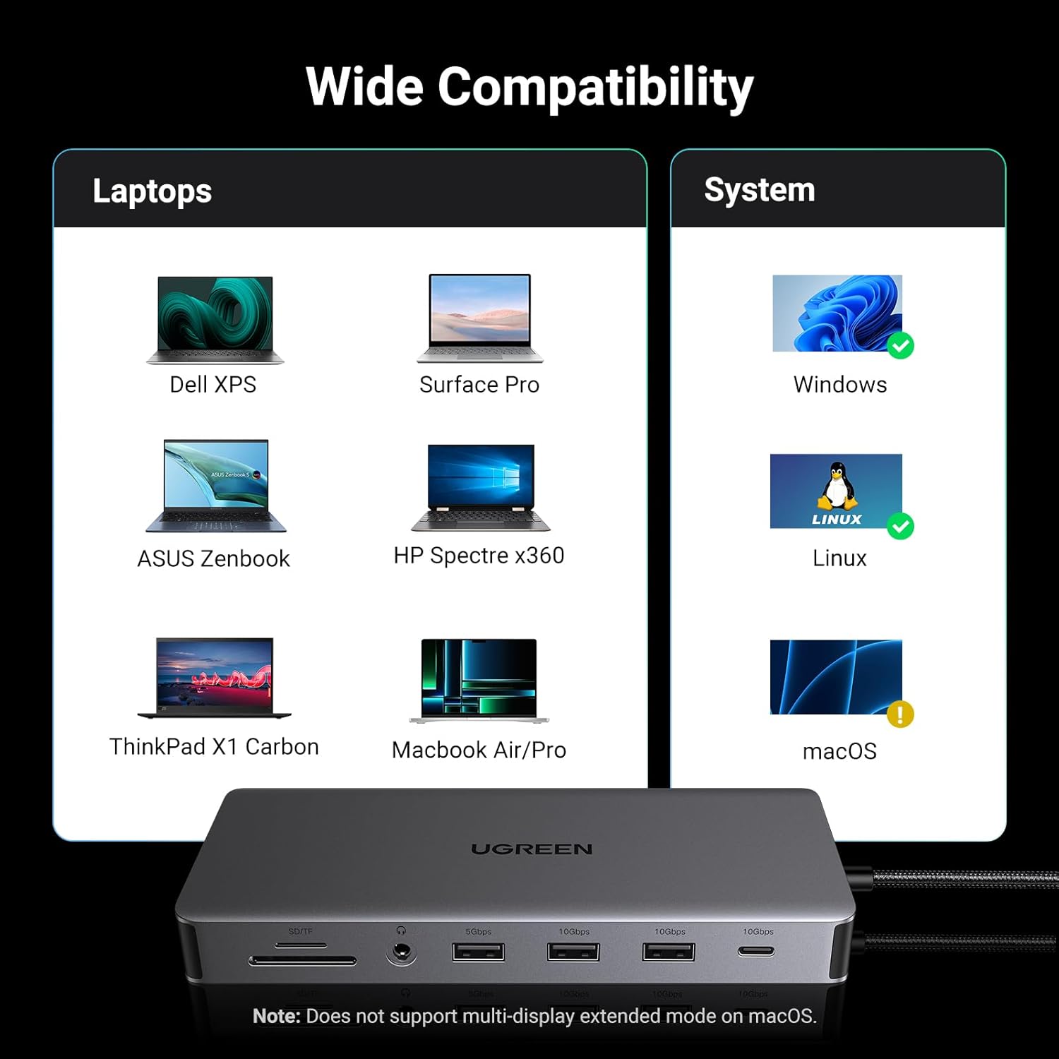13-в-1 док-станция USB‑C: Раскройте полный потенциал USB‑C порта вашего ноутбука с помощью двух портов HDMI, DisplayPort, порта USB‑C 3.2 Gen 2 (10 Гбит/с), двух портов USB‑A 3.2 Gen 2 (10 Гбит/с), двух портов USB‑A 3.0, порта Power Delivery 100 Вт, RJ45, аудиовыхода 3.5 мм и кард-ридера SD/Micro SD.