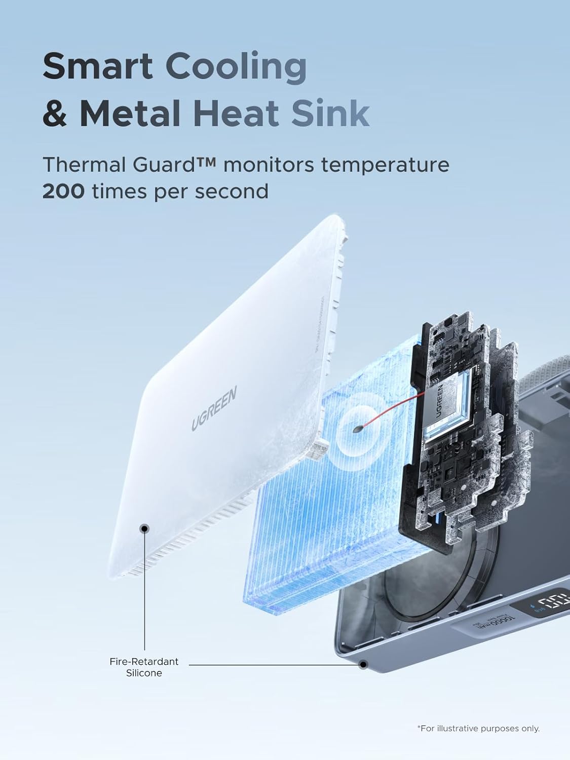 65958B Внешний аккумулятор UGREEN PB773 "MagFlow" 25W Magnetic Wireless 10000mAh Charging Qi2.2 Portable Power Bank со встроенным кабелем USB-C. Цвет: серебристо-голубой